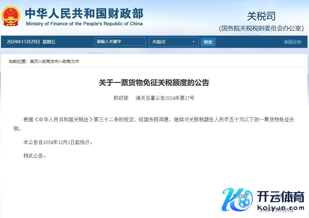 【大河财立方音讯】11月29日,财政部、海关总署公告,经国务院得意,连接对关税税额在东谈主民币五十元以下的一票货品免征关税。本公告自2024年12月1日起实行。