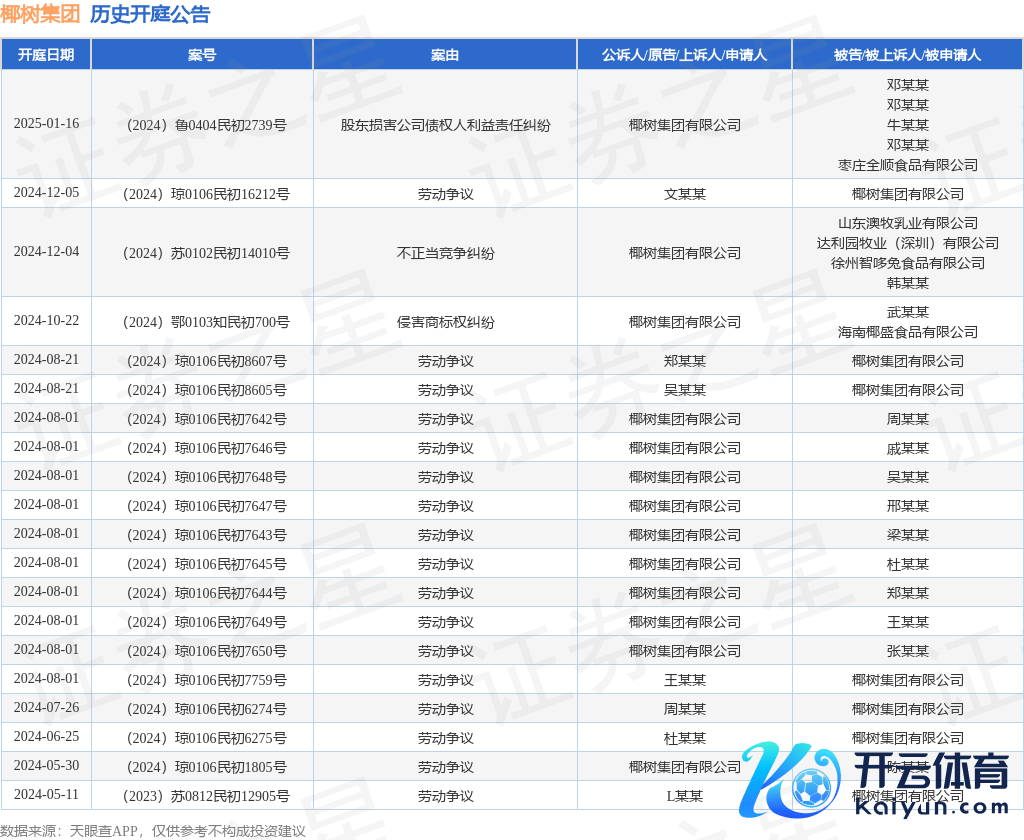 本站讯息kaiyun体育网页版登录,凭证天眼查APP裸露,近日公布了一则椰树集团有限公司行动原告/上诉东说念主的开庭公告,防护本色如下: