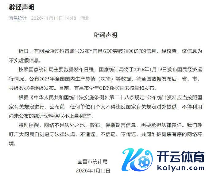 1月11日,湖北宜昌统计微信公众号发布辟谣声明,实质如下:辟谣声明近日,有网民通过抖音账号发布"宜昌GDP冲破7000亿"的信息。经核查体育游戏app平台,该信息为虚假失实信息。按照国度统计局主要数据发布日程,国度统计局将于2026年1月19日发布国民经济启动情况,公布2025年寰宇国内坐褥总值(GDP)等数据。待寰宇数据发布后,省、市、县级数据将逐级发布。当今,宜昌市全年GDP数据暂未核算和发布。把柄《中华东说念主民共和国统计法奉行条例》第二十八条规定"公布统计贵府应当按照国度干系规定进行。公布前,任何单元和个东说念主不得违抗国度干系规定对外提供,不得诳骗尚未公布的统计贵府谋取不刚直利益"。十分指示,荟萃不是法外之地,漫步、传播鬼话信息,需要承担法律包袱。咱们敕令弘大网民自愿顺服法律法例,不质问、不信谣、不传谣,共同真贵健康有序的荟萃环境。宜昌市统计局2026年1月11日